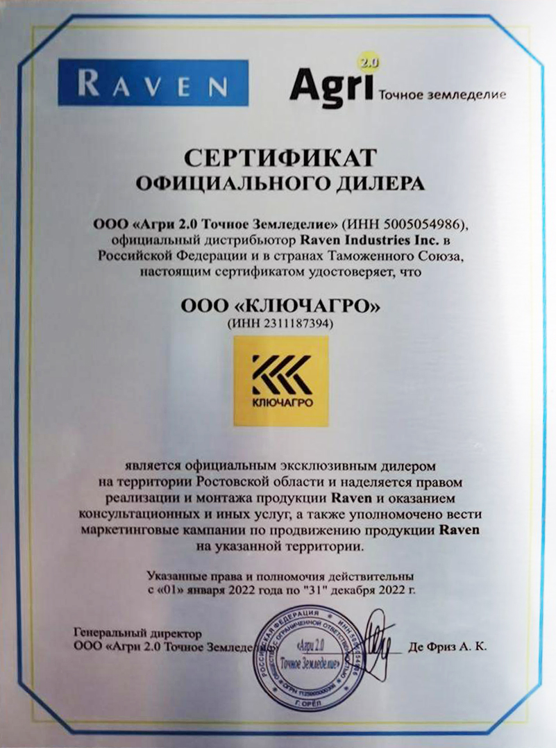 Сертификат подтверждает, что дочернее предприятие компании АГРОнавигация - компания КЛЮЧАГРО является официальным эксклюзивным дилером на территории Ростовской области и наделяется правом реализации и монтажа продукции Raven и оказанием консультационных и иных услуг, а также уполномочено вести маркетинговые кампании по продвижению продукции Raven на указанной территории в 2022 году.