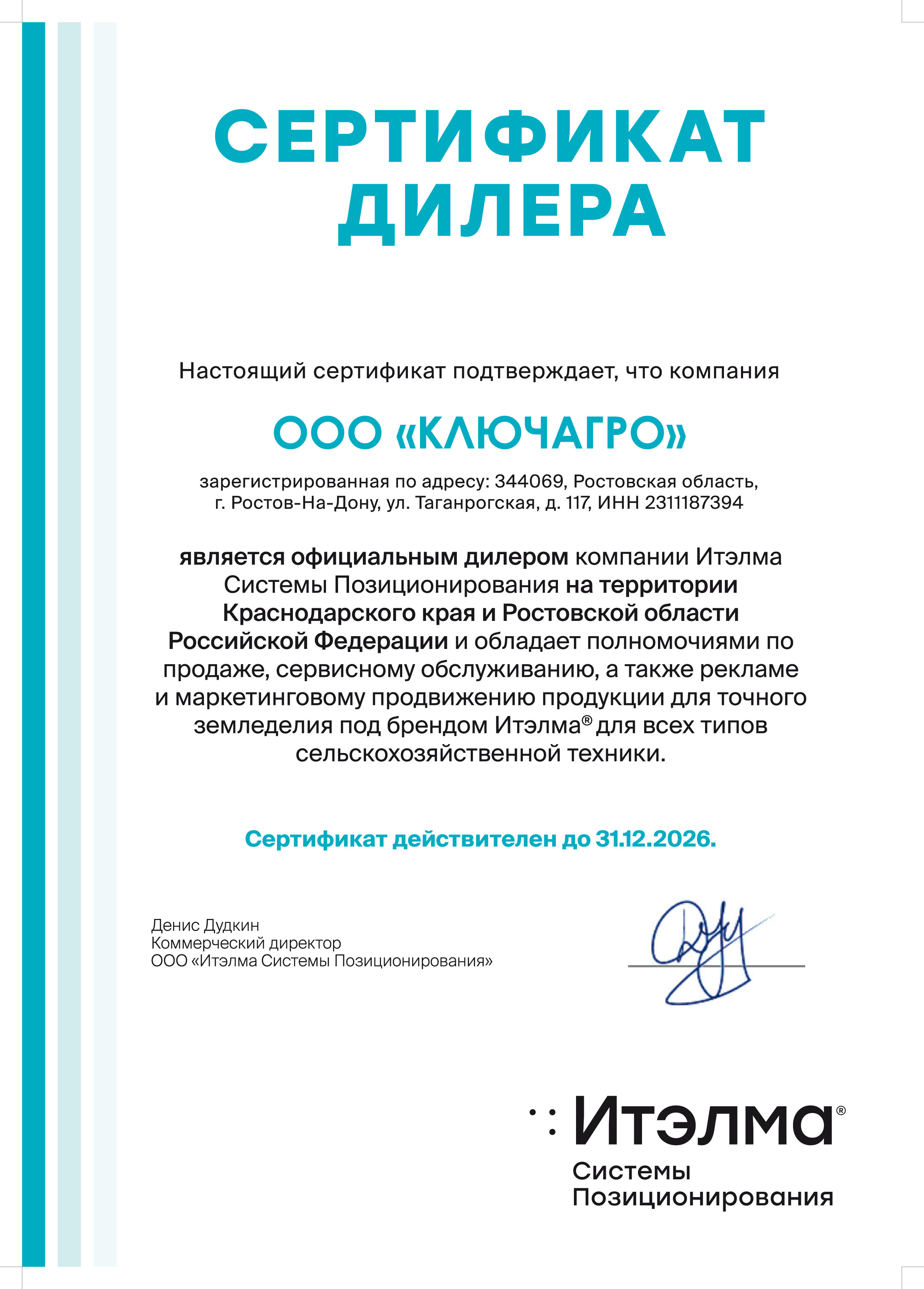 Сертификат подтверждает, что компании АГРОнавигация является официальным дилером компании Итэлма Системы Позиционирования на территории Краснодарского края и Ростовской области.